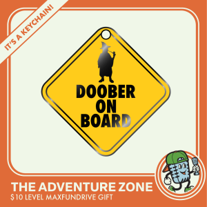 - Adventure Zone: A yellow “caution” road sign, with a silhouette of a witch and the text “Doober on Board”.