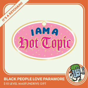 - Black People Love Paramore: “I am a Hot Topic” in blue and hot pink text, over a lighter pink background covered in small gold stars.