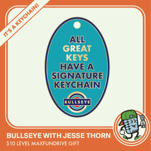 - Bullseye with Jesse Thorn: “All great keychains have a signature keychain” in dark blue and metallic gold text on a teal background. The Bullseye logo is beneath the text.