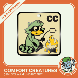 - Comfort Creatures: A smiling racoon roasting a marshmallow over an open fire, with the initials “CC” in black metal in the corner.