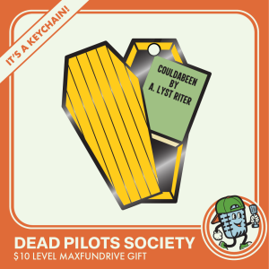 - Dead Pilots Society: A gold coffin with a green script poking out of it. The script cover reads “Couldabeen by A. Lyst Riter” (Could have been by A-List Writer).
