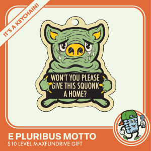 - E Pluribus Motto: A green squonk (a pig-like cryptid that’s constantly crying). True to form, it is crying, and holding a sign reading “Won’t you please give this squonk a home?”