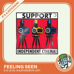- Feeling Seen: Three cameras (two blue, one yellow) over a red background. Text spanning across the top and bottom reads “Support independent cinema!”