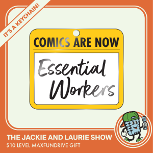 - Jackie and Laurie Show: “Comics are now essential workers” on a design like an announcement sign hanging in a store window.