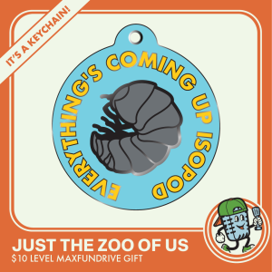 - Just the Zoo of Us: “Everything’s coming up isopod” in gold text around a curled-up pillbug (AKA rolly polie, AKA potato bug).