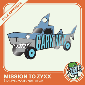 - Mission to Zyxx: A car shaped like a shark, with the text “Cark Keys” along the side in bright teal text.