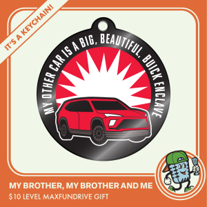 - My Brother, My Brother, and Me: “My other car is a big, beautiful, Buick Enclave” above a red Buick Enclave (a mid-size SUV).