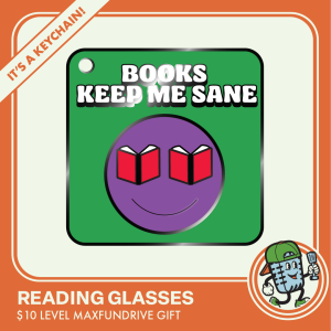 - Reading Glasses: “Books keep me sane” above a purple smiley face that has red books for eyes.