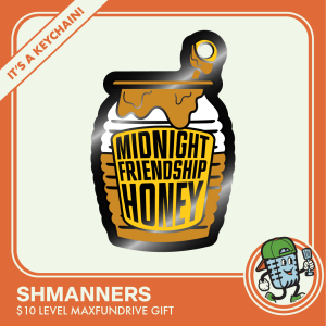 - Shmanners: A beehive-shaped honeypot dripping honey from the top. The label says “Midnight Friendship Honey”.