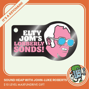 - Sound Heap: A caricature of an Elton John-looking man and the text “Elty Jom’s Lobberly Sonds!” in white and pink.
