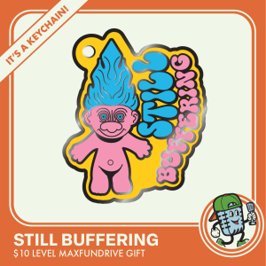 - Still Buffering: A pink-and-blue Troll doll with the text “Still Buffering” in a vintage font.