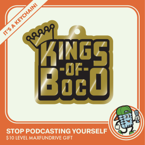 - Stop Podcasting Yourself: A gold-and-black keychain with the text “Kings of BoCo” in bubble letters and a crown on top of the text.