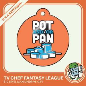 - TV Chef Fantasy League: The text “Pot and/or Pan” above a collection of pots and pans over a light orange background.