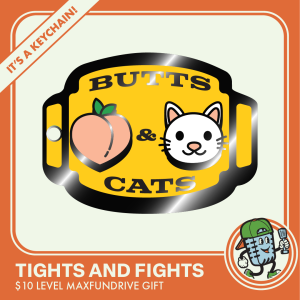 - Tights and Fights: A wrestling championship belt-inspired shape, with the text “Butts and Cats” and emoji-like illustrations of a peach and a white cat face.