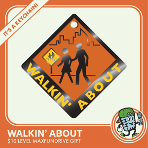 - Walkin’ About: A pedestrian crossing sign, altered to have an orange skyscape background and the text “Walkin’ About” on the bottom.