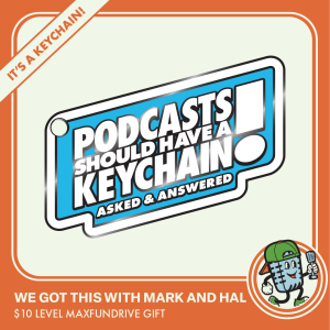 - We Got This with Mark and Hal: “Podcasts should have a keychain! Asked & Answered” on bold white text above a light blue background.