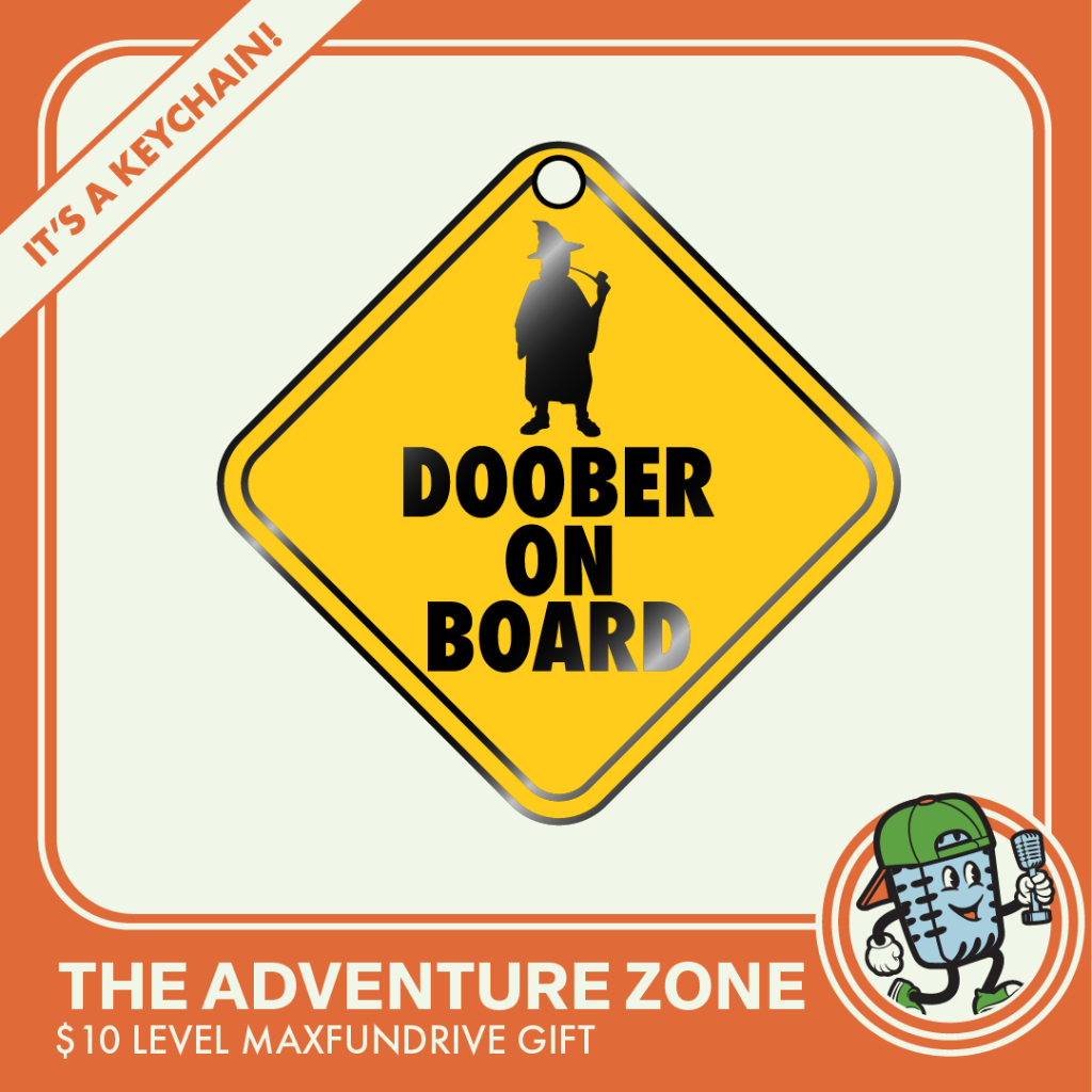 Adventure Zone: A yellow “caution” road sign, with a silhouette of a witch and the text “Doober on Board”.