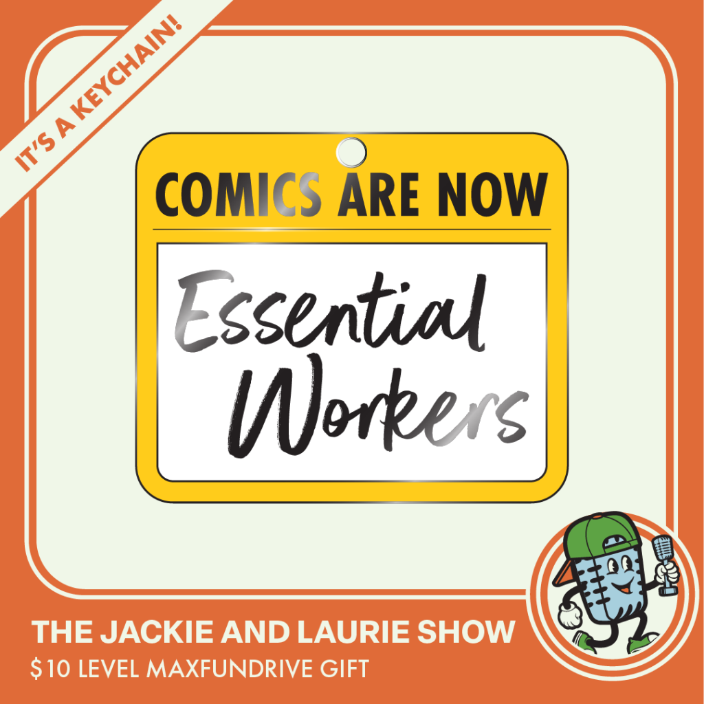 Jackie and Laurie Show: “Comics are now essential workers” on a design like an announcement sign hanging in a store window.
