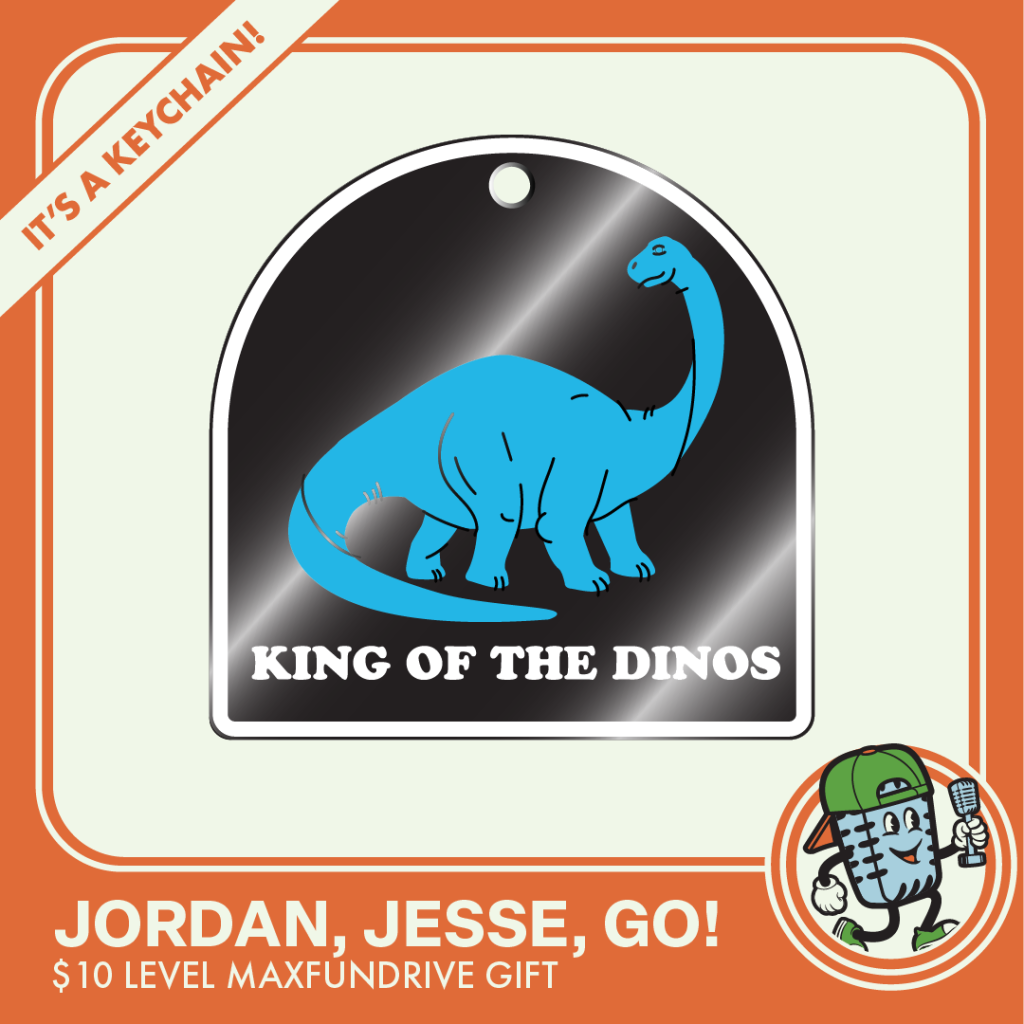 Jordan Jesse Go: “King of the dinos” in white text below a smiling blue brontosaurus.