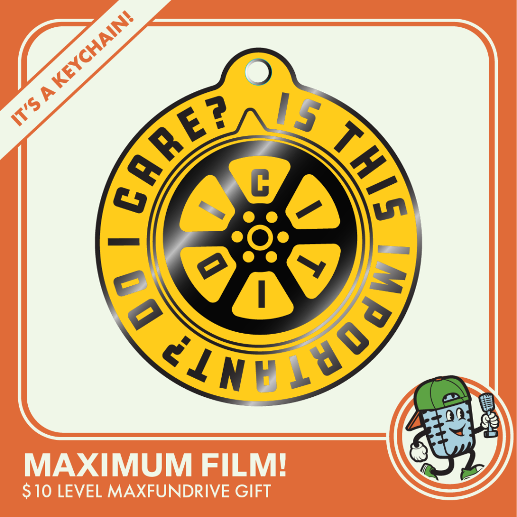 Maximum Film!: A decoder ring-inspired design that reads “Is this important? Do I care?” on the outer circle and “ITIDIC” on the circle ring.
