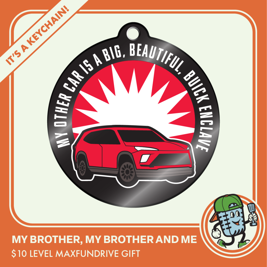 My Brother, My Brother, and Me: “My other car is a big, beautiful, Buick Enclave” above a red Buick Enclave (a mid-size SUV).