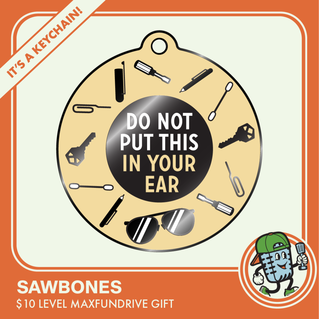 Sawbones: “Do not put this in your ear” surrounded by small drawings of a pen, a q-tip, a key, a paperclip, a screwdriver, sunglasses, and a pen cap.