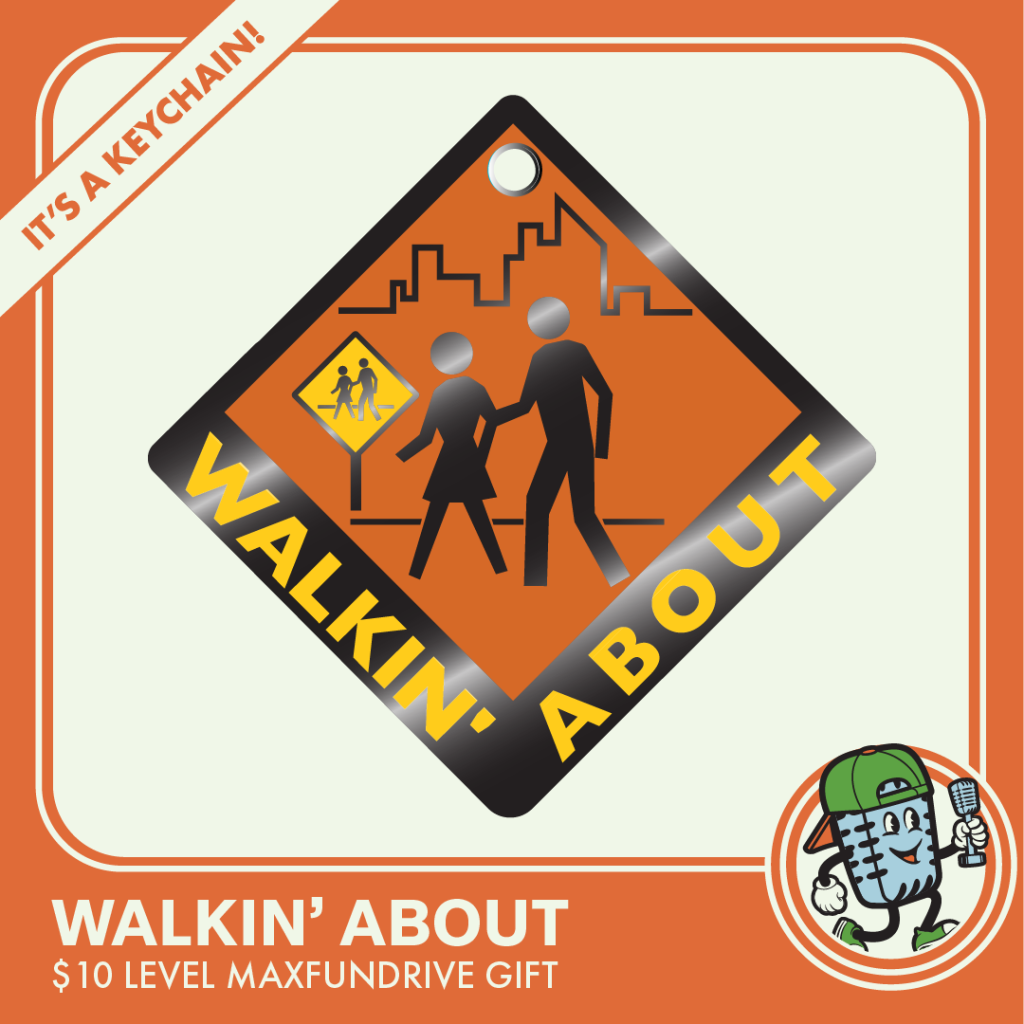 Walkin’ About: A pedestrian crossing sign, altered to have an orange skyscape background and the text “Walkin’ About” on the bottom.
