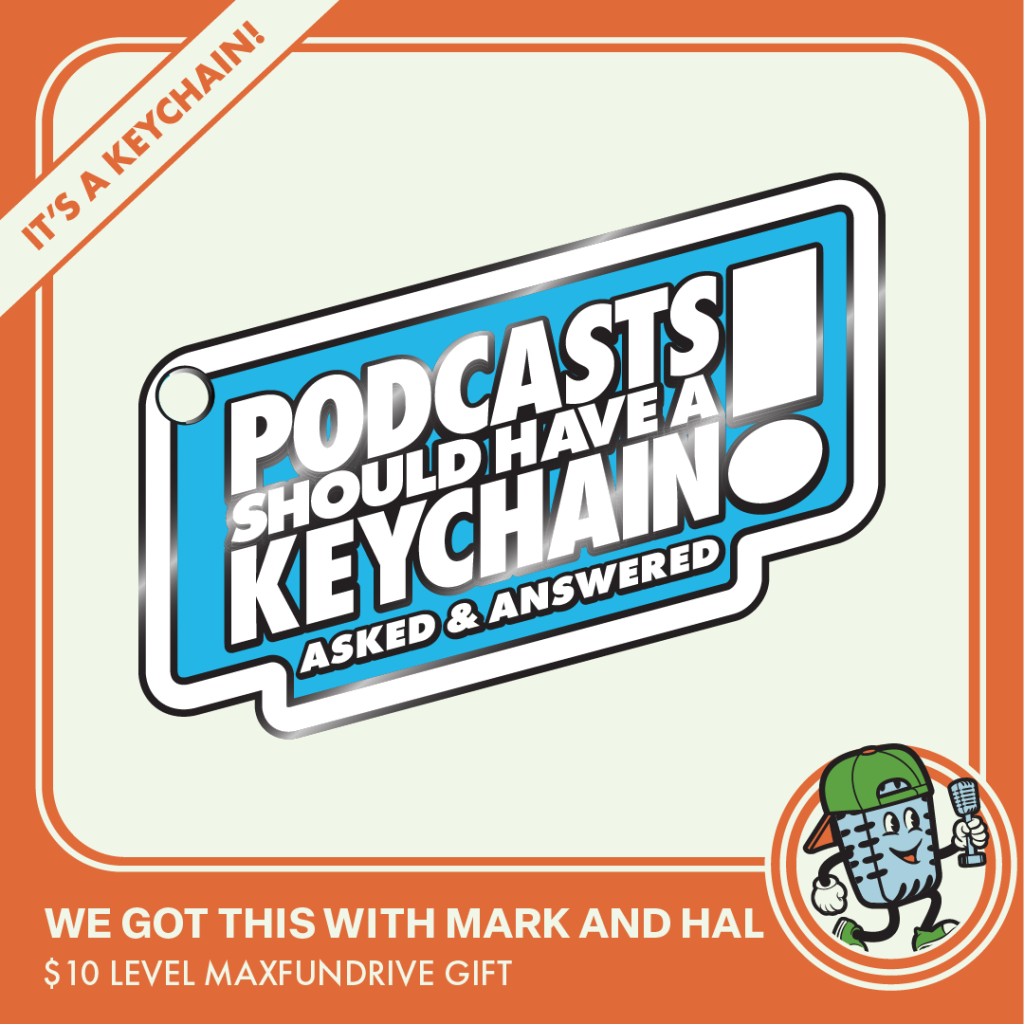 We Got This with Mark and Hal: “Podcasts should have a keychain! Asked & Answered” on bold white text above a light blue background.